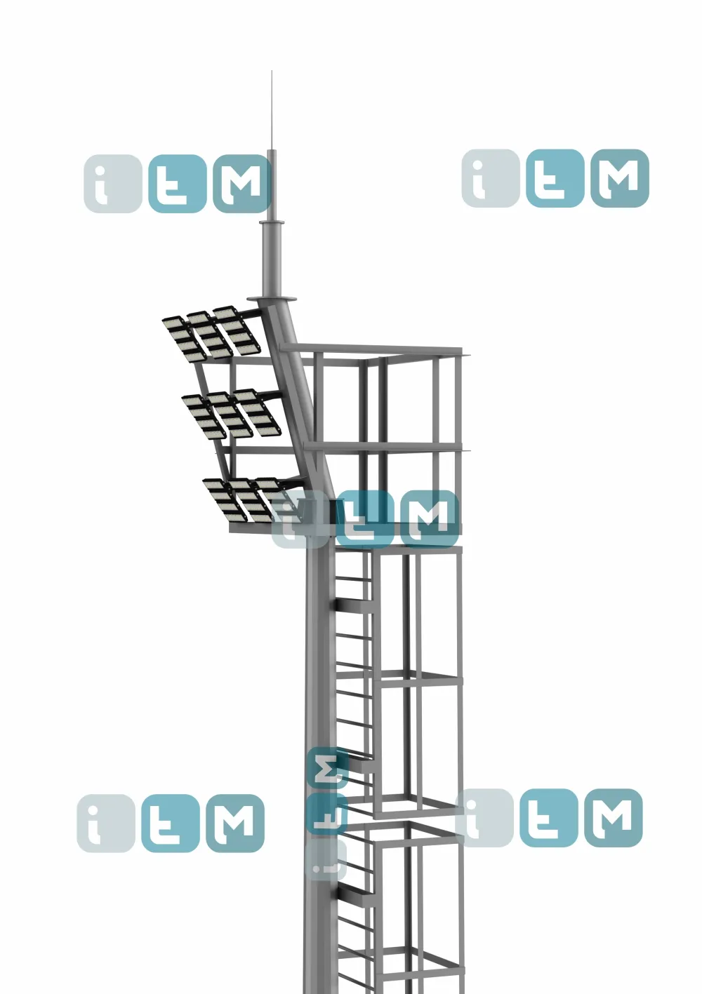 Мачта со стационарной короной обязательно должна быть укомплектована лестницами и площадками для отдыха во время подъема, поскольку высота конструкции составляет от 16 метров и чтобы заменить осветительные приборы, специалисту нужно подняться на вершину конструкции.