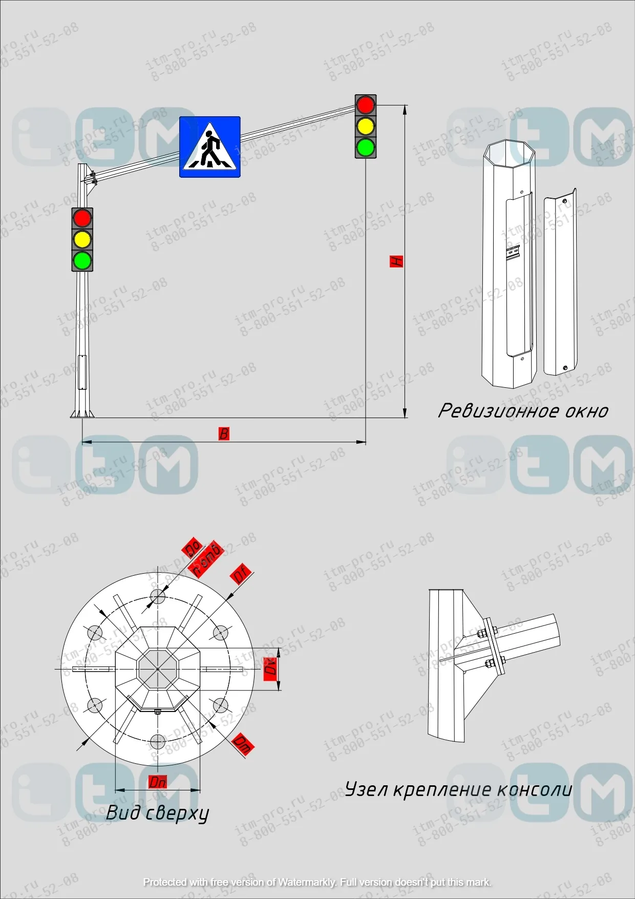 Закладная деталь фундамента приобретается отдельно. Параметры фундамента рассчитываются в зависимости от конфигурации светофорной опоры и места установки.